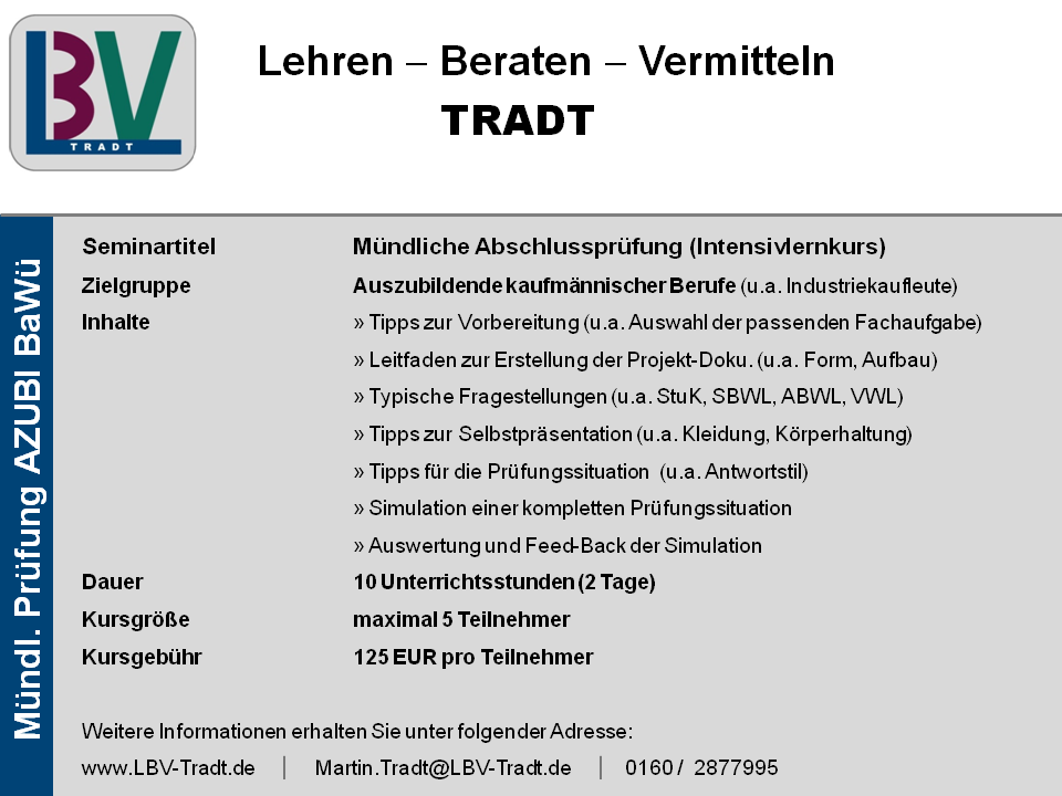 Die Firma LBV Tradt bietet seit 2011 Intensivlernkurse zur Vorbereitung auf die mündliche Abschlussprüfung für kaufmännische Auszubildende an.