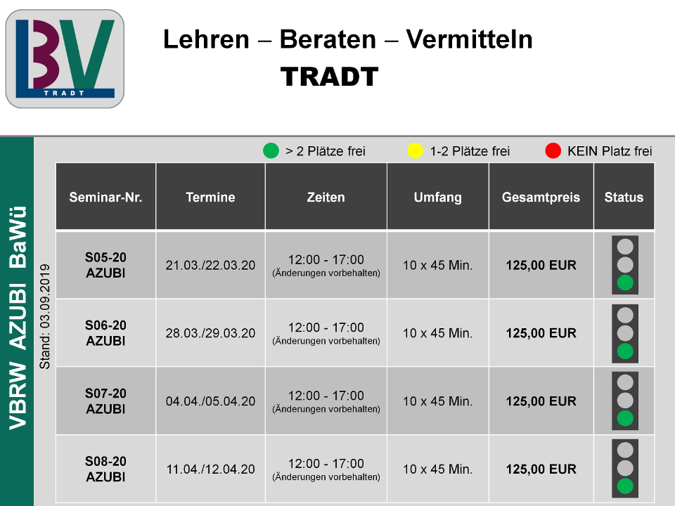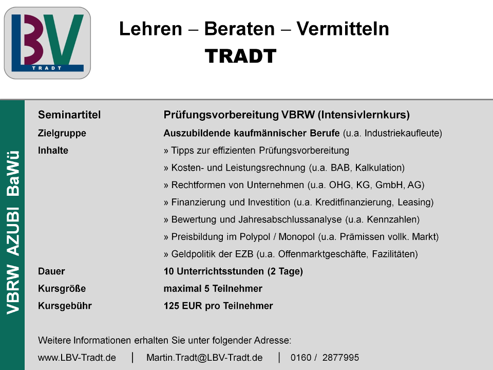 Die Firma LBV Tradt bietet seit 2011 Intensivlernkurse zur Vorbereitung auf die schriftlichen Prüfungen in den Fächern Steuerung und Kontrolle (StK), Allg. Wirtschaftslehre bzw. Gesamtwirtschaft (AWL/GW) sowie Spezielle BWL (SBWL) an.
